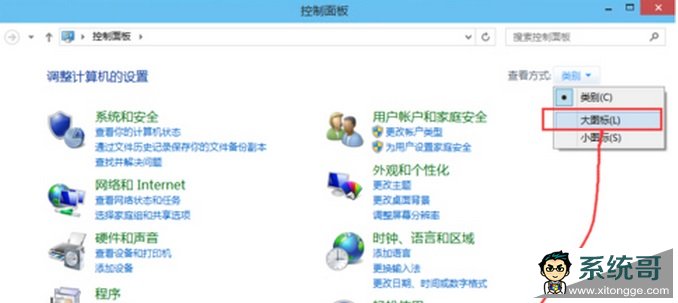 1、点击“开始“菜单,点击”控制面板”选项,然后右上角点击切换到大图标模式。