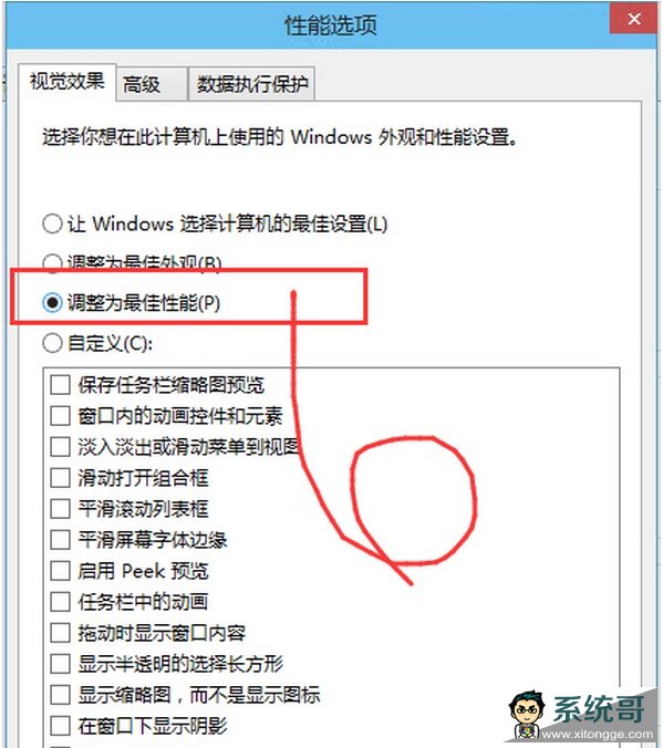 3、在性能选项的视觉效果栏里可以看到有4种设置模式。设置调整为最佳性能模式。