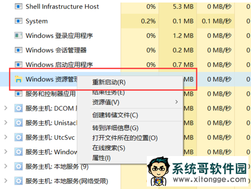 关闭注册表后,进入任务管理器,找到windows资源管理器,右键点击重新启动。