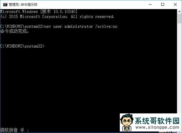 6、使用过后如果想关闭Administrator帐户,可以按同样的方法打开命令提示符窗口,输入命令net user administrator /active:no回车就可以了。