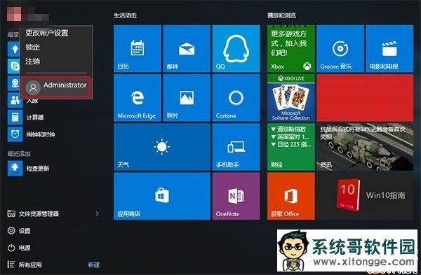 3、之后点击开始菜单中的帐户头像,就可以选择Administrator帐户了。
