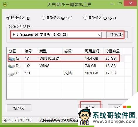 打开大白菜装机工具,点击“浏览”,将u盘中的win10镜像添加进来,选择c盘为安装盘,点击“确定”。如下图所示: