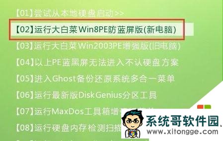 接着移动方向键选择第二项进入大白菜win8pe系统。如下图所示: