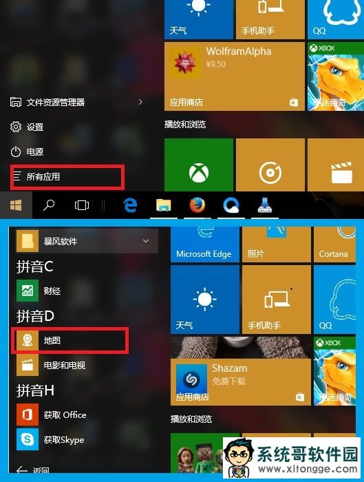 第一种,就是如下图,按下Windows键,在所有应用中找到地图。这种方法在搜索应用程序时通用。