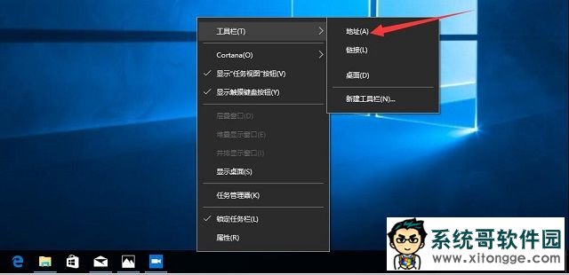 01.我们在任务栏上单击右键,在弹出的快捷菜单中展开“工具栏”,单击“地址”选项,如图所示。