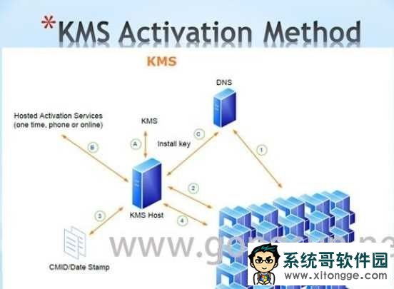KMS采用客户端-服务器拓扑结构,个人电脑只需通过本地网络即可获得授权服务。 KMS客户端计算机通过DNS域名系统或者静态配置连接至KMS主机,KMS主机通过RPC远程过程调用发放授权。 KMS主机可以在安装Windows Server 2003及以上系统的物理机或者虚拟机中运行。
