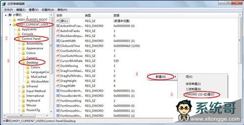 接着,依次展开到HKEY_CURRENT_USER\Control Panel\Desktop,然后在空白处单击右键,新建一个“DWORD 32位值”。