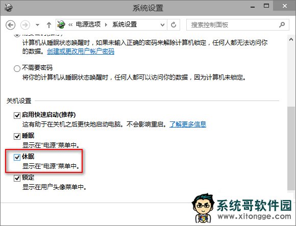 4、解锁之后,将该窗口下方“关机设置”里的第三项“休眠,把“休眠”选项勾上,最后点击“保存修改”退出;