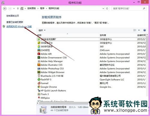 4、在程序和功能窗口里,我们点击左侧导航上的启用或关闭Windows功能。