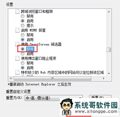 2、按照如下步骤依次点击:工具 - Internet选项 - 安全 - 自定义级别 - 使用Smart Screen筛选器 - 禁用。
