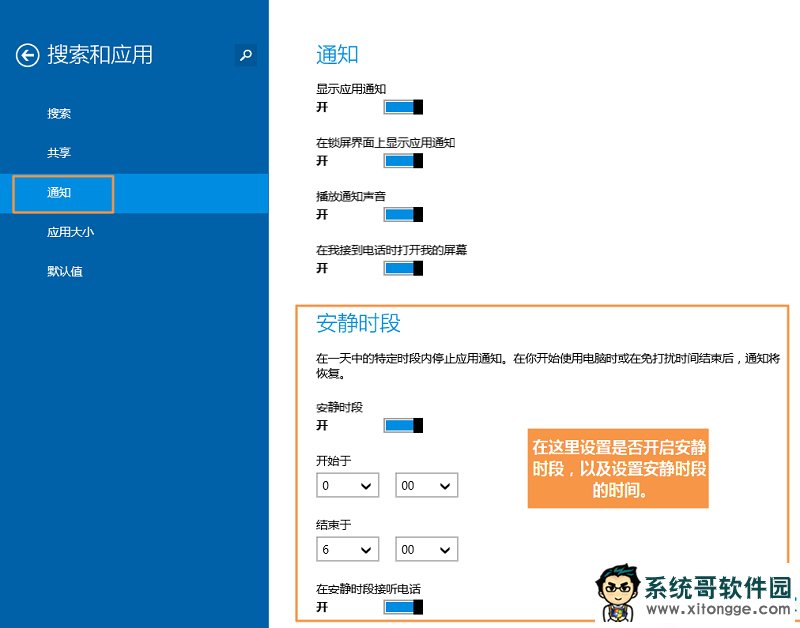 以上就是Win8.1调整APP通知显示时间的方法了,方法很简单,我们只需要依次打开“更改电脑设置”——“搜索和应用”——“通知”——“安静时段”,之后我们就可以设置免打扰时间以及是否接收的应用了。