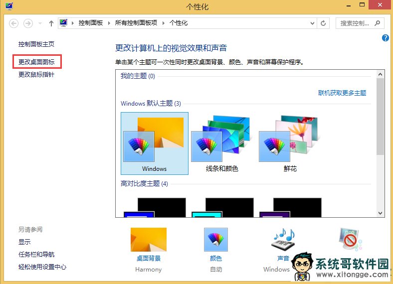 2、进入“个性化”设置页面,之后选择“更改桌面图标”。