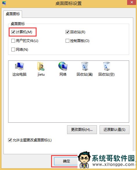 3、进入“桌面图标设置”页面,之后我们勾选“计算机”,在点击“确定”。