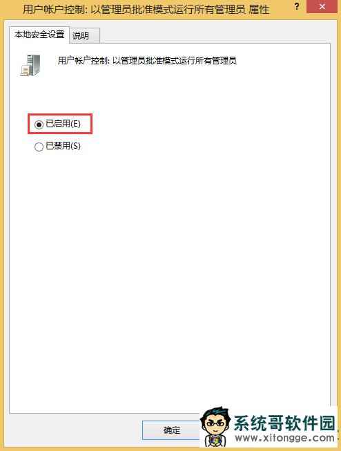3、在右侧双击打开{用户账户控制:用于内置管理员账户的管理员批准模式属性},点击已启用,然后点击应用保存即可。