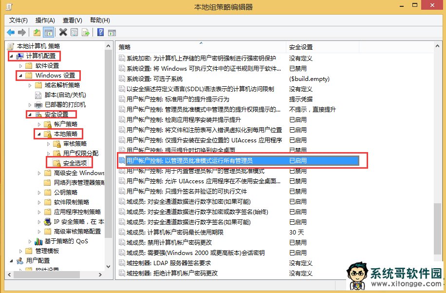 2、进入组策略之后,依次找到计算机配置—Windows设置—安全设置—本地策略—安全选项。
