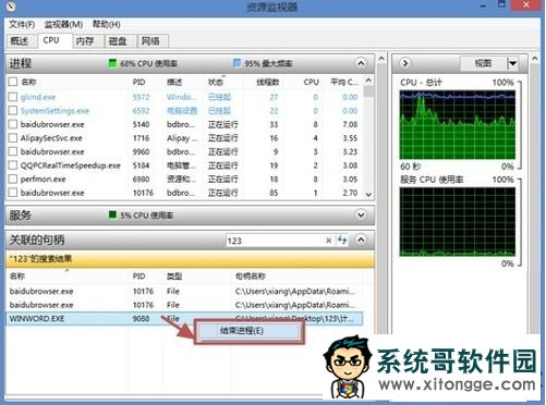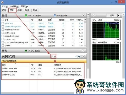 4、打开“资源监视器”对话框,在“CPU”选项卡中“关联的句柄”右侧输入框输入文件或文件夹名(可以使部分名称),稍会下方窗格中会显示关联的句柄。