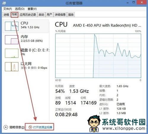 3、打开“任务管理器”,在“性能”选项卡,单击下方的“打开资源监视器”。