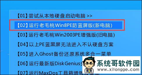 1、在主菜单界面用键盘方向键“↓”将光标移至“【02】运行老毛桃Win8PE防蓝屏版(新电脑)”,回车确定,如图所示 :
