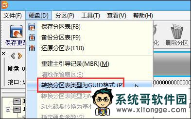 4、然后点击硬盘,选择转换分区表类型GUID格式,如图所示: