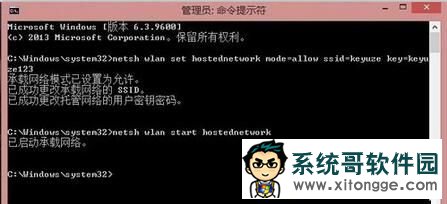 3、然后再继续输入netsh wlan start hostednetwork,然后回车进入;