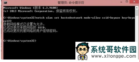 2、然后在弹出的窗口输入netsh wlan set hostednetwork mode=allow ssid=(这里输入局域网的名字) key=(这里输入设定的密码),然后回车进入;