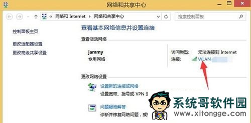 2、进入网络和共享中心,点击“连接”右侧的WLAN,如图:
