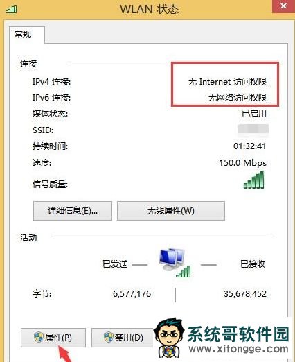 3、进入WLAN状态页面,显示无Internet访问权限,点击打开页面下方的属性按钮,如图: