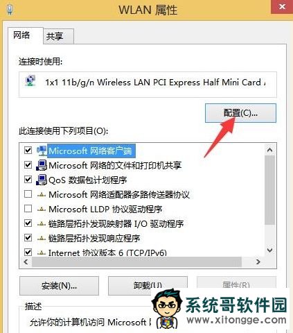 4、进入WLAN属性页面,点击打开配置按钮,如图: