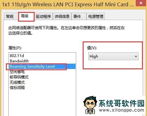 6、返回到高级选项卡,属性选择“Roaming Sensitivity Level”,将值选为“High”,如图: