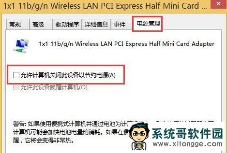 5、在无线网卡的配置页面中,选择电源管理选项卡,去掉“允许计算机关闭此设备以节约电源”的勾选,确定后保存,如图: