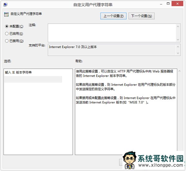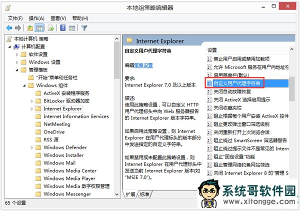 4、双击“自定义用户代理字符串”设置项,打开编辑窗口;