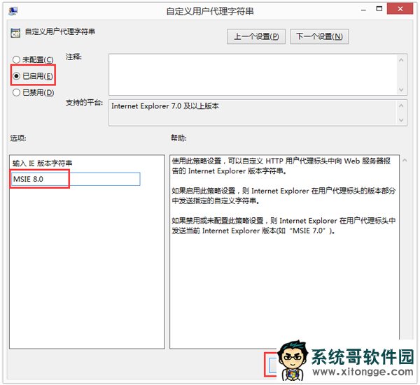 5、在窗口上方选中“已启用”,然后在下面的“选项区域”输入IE版本字符串“MSIE 8.0”,最后点击确定关闭窗口,并重启IE11浏览器。