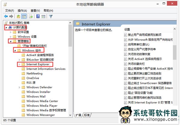 2、打开“本地组策略编辑器”,在左侧列表中定位到“计算机配置→管理模板→Windows 组件→Internet Explorer”;