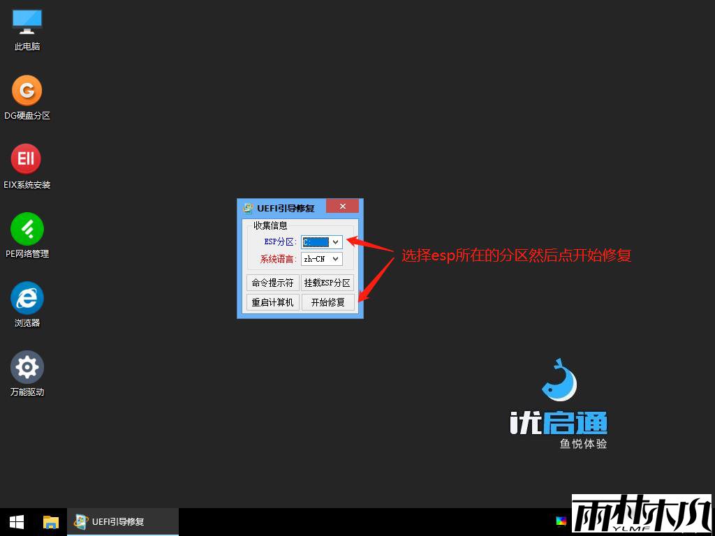 有的ghos装机工具并未自带修复引导功能, ghost完重启可能会引导不了进系统,这时就要用到修复uefi工具,还是进pe系统运行uefix