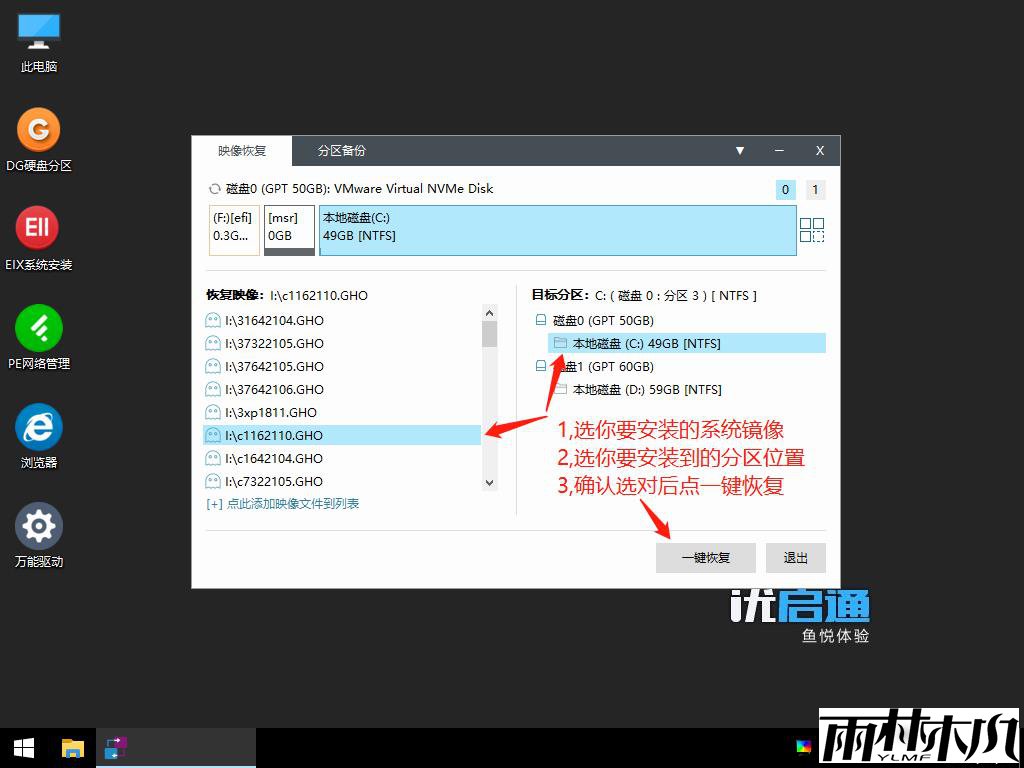 选择你要安装的系统镜像,要安装到的分区位置,然后一键恢复
