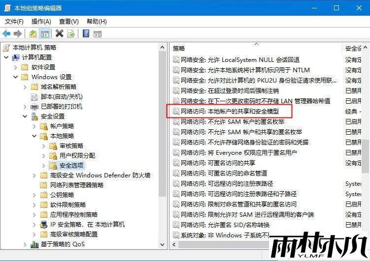 依次展开 “计算机配置”→“Windows 设置”→“安全设置”→“本地策略”→“安全选项”,找到 “网络访问:本地帐户的共享和安全模型” 并双击。