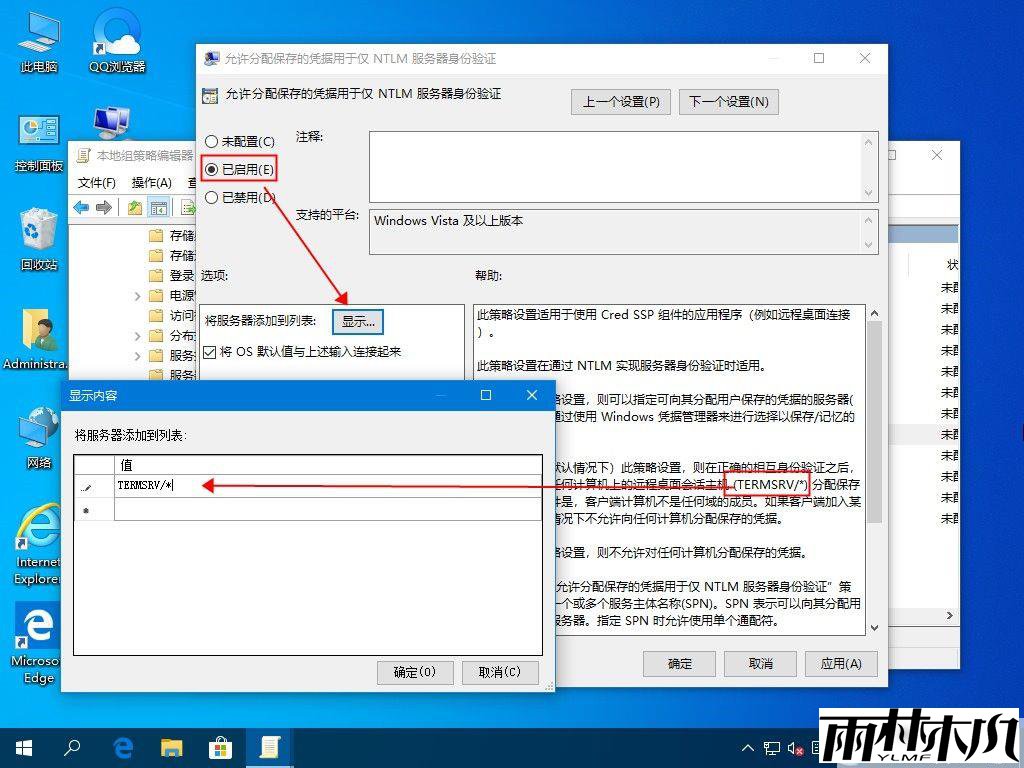 选择 “已启用”,然后单击 “显示”,输入 “TERMsRV/*”,点击 “确定” 后退出。
