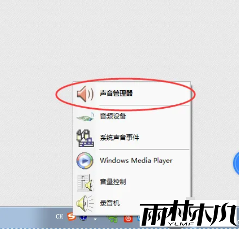 1、打开电脑进入桌面,点击右下角下喇叭处打开声音管理器.