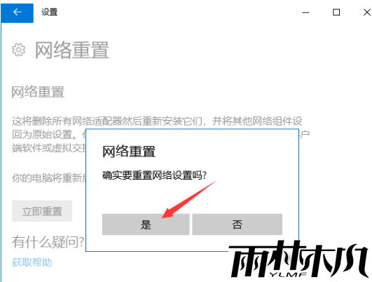 5、点击立即重置后弹出小窗口确实要重置网络设置吗?点击【是】,即会删除当前电脑中所有网络设备的驱动,再重新安装就完成了。