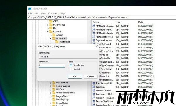 双击打开这个TaskbarSi值,将“value data”更改为“0”重启之后就是小任务栏了。(数字“0”是小任务栏,“1”是中任务栏,“2”是大任务栏)。