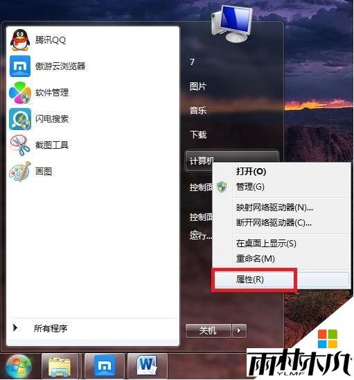 1 在键盘上按“win+R”快捷键,打开开始菜单,右键单击“计算机”,选择“属性”;如图5所示