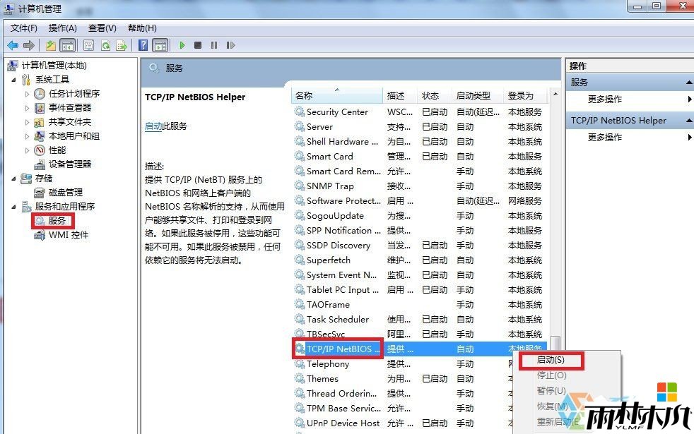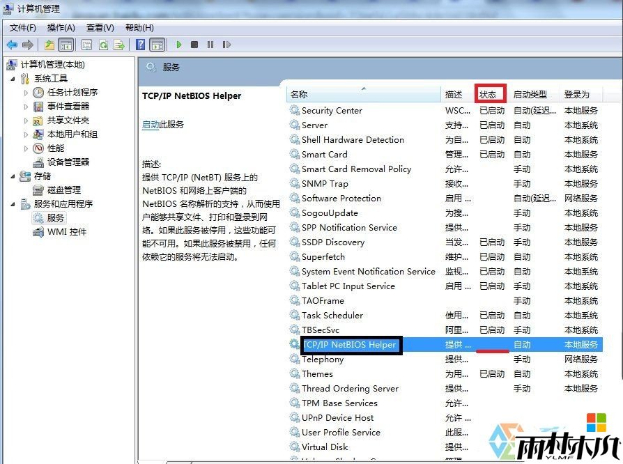 4、在右侧的服务列表中找到TCP/IP NetBIOS Helper这个服务,在状态栏中查看下是否已开启。下图表示未开启。