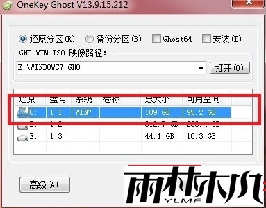 4、在Onekey ghost选择还原分区,在GHO WIM ISO映像路径中选择刚才下载的Win7系统镜像Windows7.GHO,见下图。