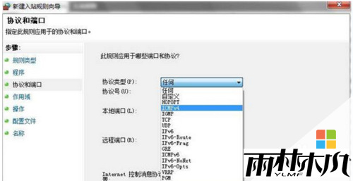 然后点击左侧的协议和端口,然后点击协议类型后面的下拉按钮,选择“TCMPv4”项;