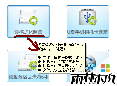 2双击运行刚刚下载好的软件,点击“误格式化硬盘”。软件主界面的六大功能,大家用鼠标放在任一功能上就会看到该功能的主要信息。如下图所示: