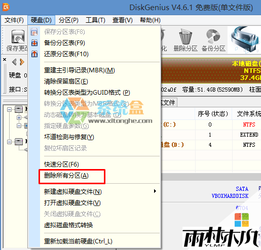 10、打开Diskgenius后,选择笔记本硬盘,然后点击“硬盘”——“删除所有分区“,删除前确保资料已经转移,删除后,点击保存更改;
