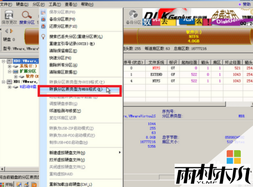 进入之后,鼠标挑选到硬盘,点击右键,然后挑选到“转换分区表范例为MBR格式(B)”,点击鼠标左键,将会弹出一个肯定窗口!