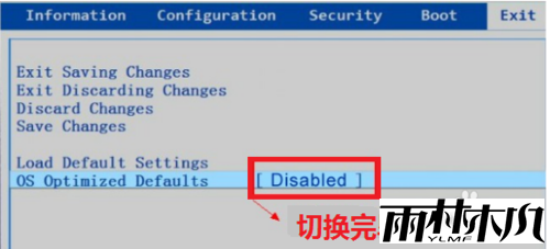 以下图所示,先按左右”←→“键将光标移至“Exit”选项处,再按高低键挑选到“OS Optimized Defaults [win8 64Bit]”处,按回键,将[]里面的“win8 64Bit”换成“disabled”